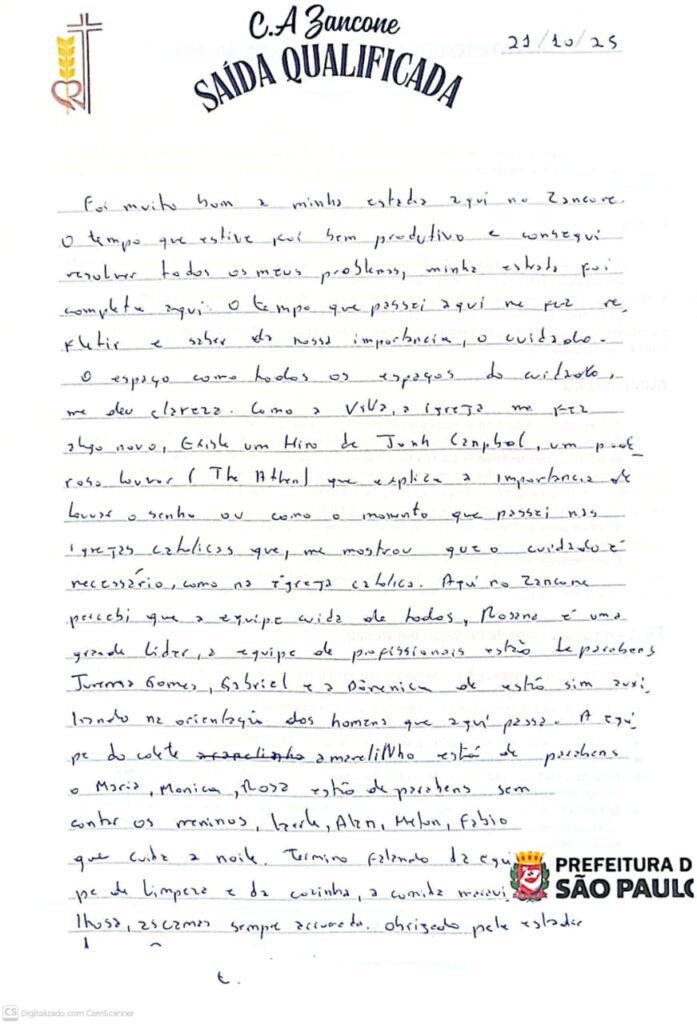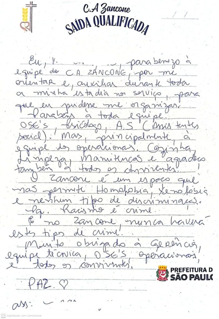 Carta Centro de Acolhida Zancone